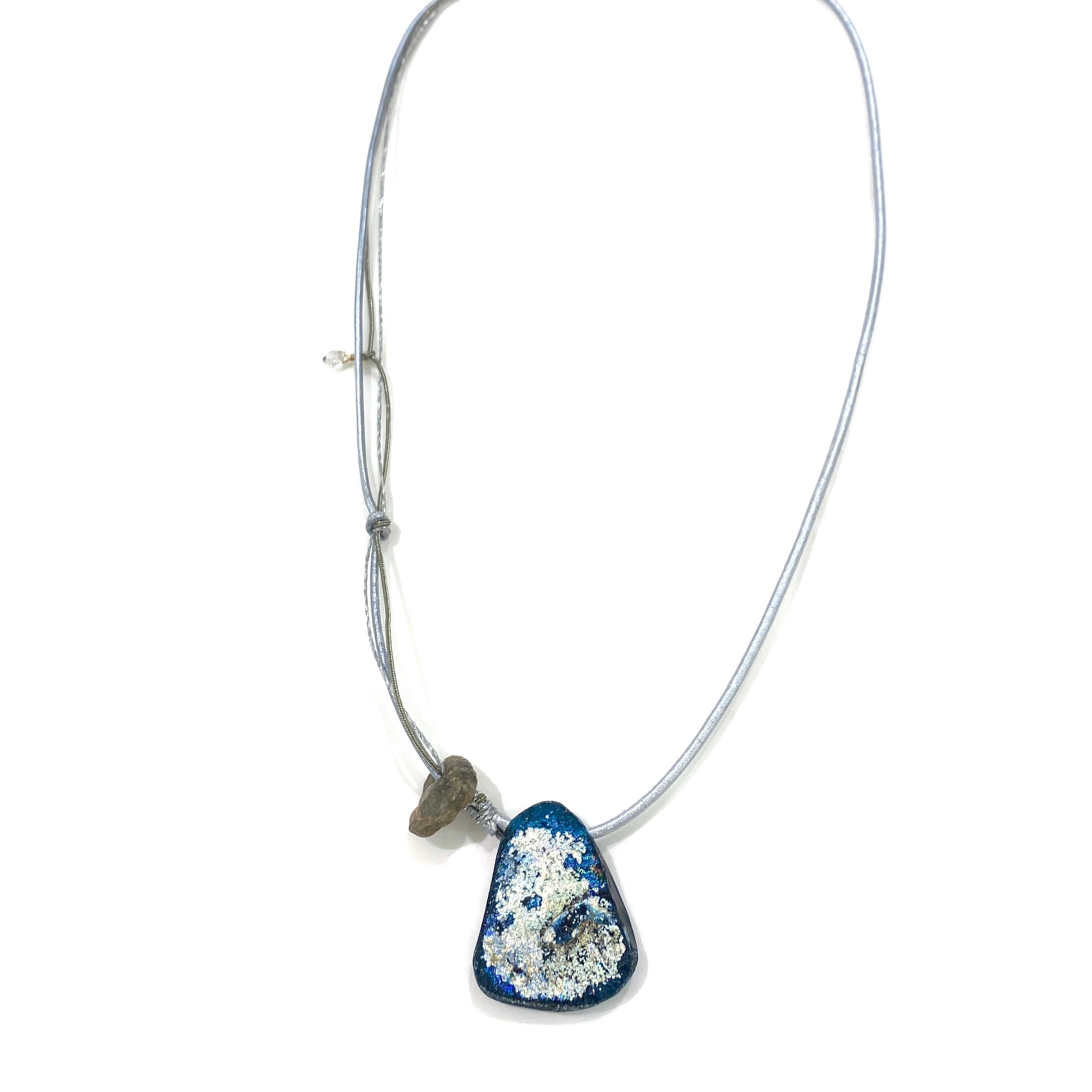 ブルーローマンガラスの美しい輝きとシルバーレザーが絶妙に融合したネックレスです。